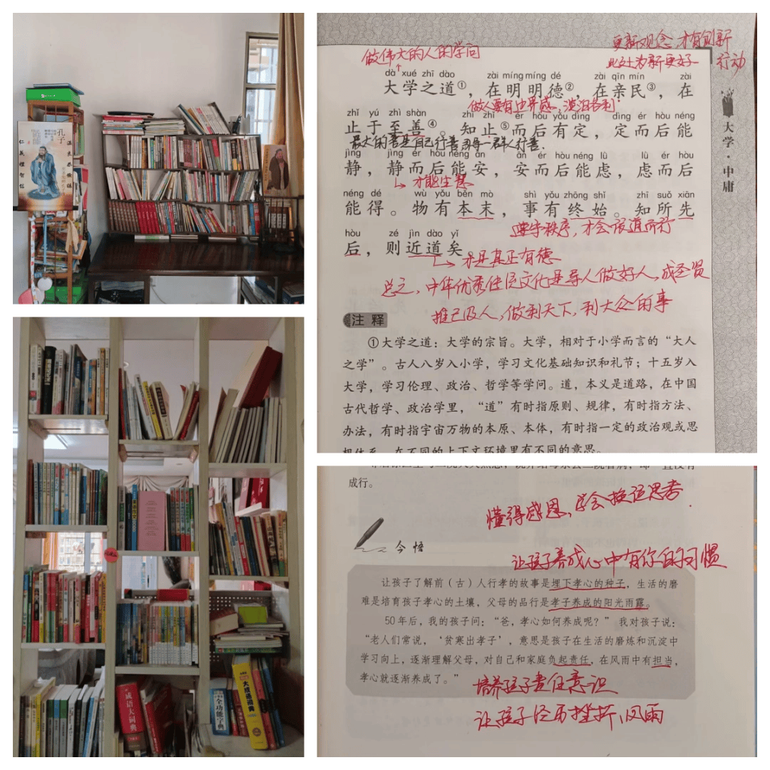 张运祥现为岑巩县实验学校的一名语文教师。走进他的家,简陋的书柜、书架、书桌上,俯首即是中华优秀传统文化典籍。这其中,既有《朗诵艺术创造》《爱心与教育》《吟诵概论》等专业书籍,也有《孩子的成长,妈妈的修行》《爱的五种语言》等实用著作,更有每天与孩子们交流时必须翻阅的《中华经典吟诵》《小学生的吟诵课》等教辅教材。那些已经翻卷边了的书目上的批注“大学就是做伟大的人的学问”“心正,正就是无私。推己及人,正人先正己”“强大自己,照亮别人。积善立德,报效国家 ”……生动地刻印着张运祥这一家人年长日久与经典诵读相伴的岁月点滴。